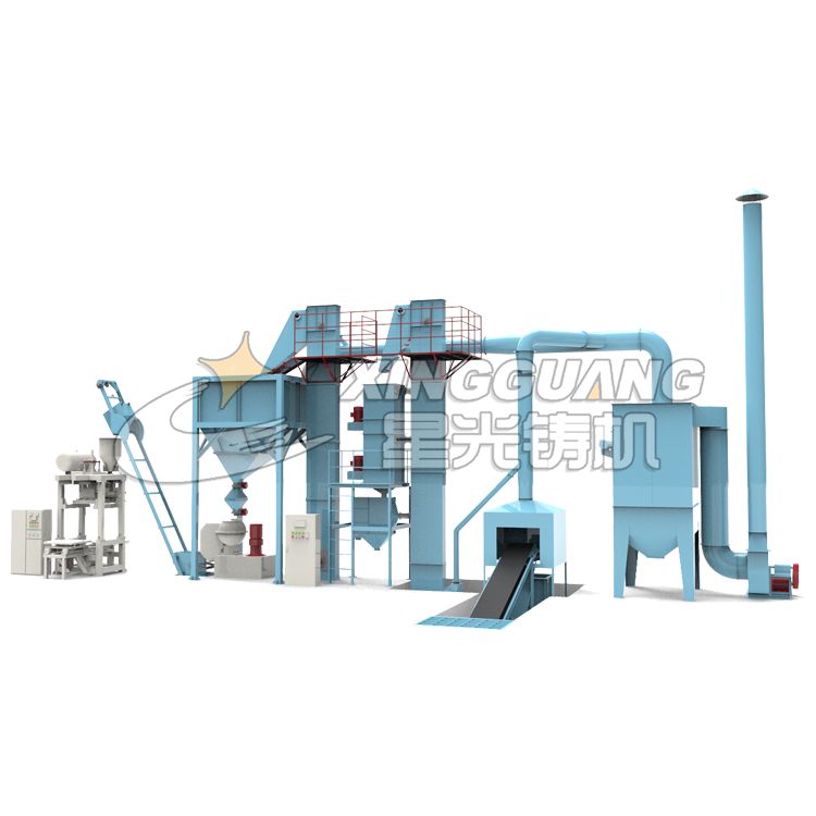 冷芯盒射芯机可以配砂再生系统,将用过的砂子回收再生,重新利用。旧砂再生就是将浇筑后的砂子送入砂回收再生系统,经输送机送入振动破碎机,破碎、筛分后再由提升机送入涡流搓擦再生机,通过一系列破碎、搓擦使砂粒表面的粘结剂膜脱离砂粒,同时可以调整砂粒粒度,由除尘系统将再生砂中的粉尘去除,使其能够十分经济的代替新砂使用。旧砂回收再生可以大大节省新砂投入以及丢弃旧砂的运输、场地等费用。且再生砂粒均匀,表面光滑、热稳定性好,有利于提高铸件质量,尤其是可以减少树脂加入量,降低成本,亦能减少因排放废砂造成的环境污染。